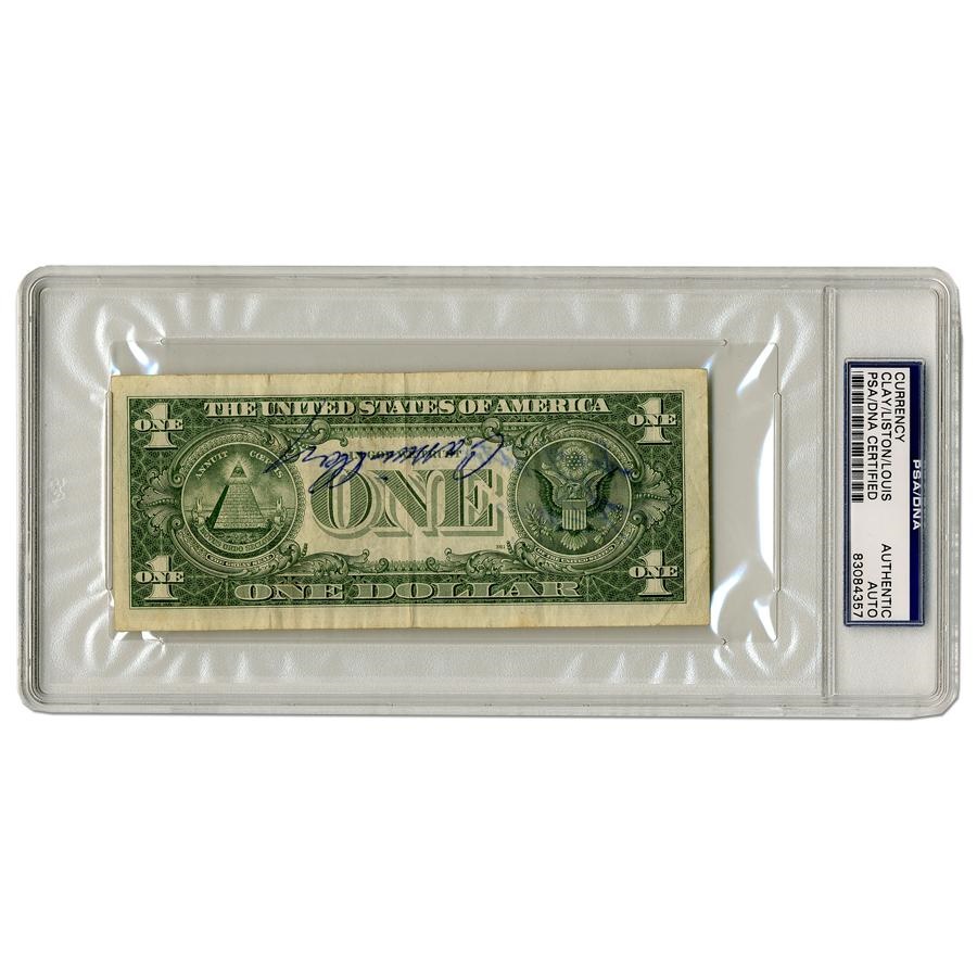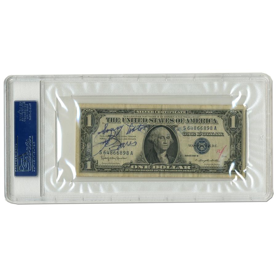 This one dollar bank note was originally backed by silver that was deposited in the United States Treasury and, until June 24, 1968, it could be redeemed for the actual silver. The blue Treasury seal on the front identifies it as a Silver Certificate. It has been signed on the front by Sonny Liston and Joe Louis. Cassius Clay (Muhammad Ali) signed the back of the bill. All fighters autographed in blue ballpoint pen. PSA/DNA certified authentic.