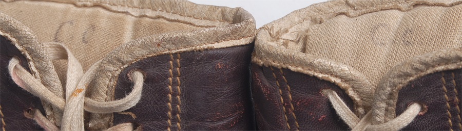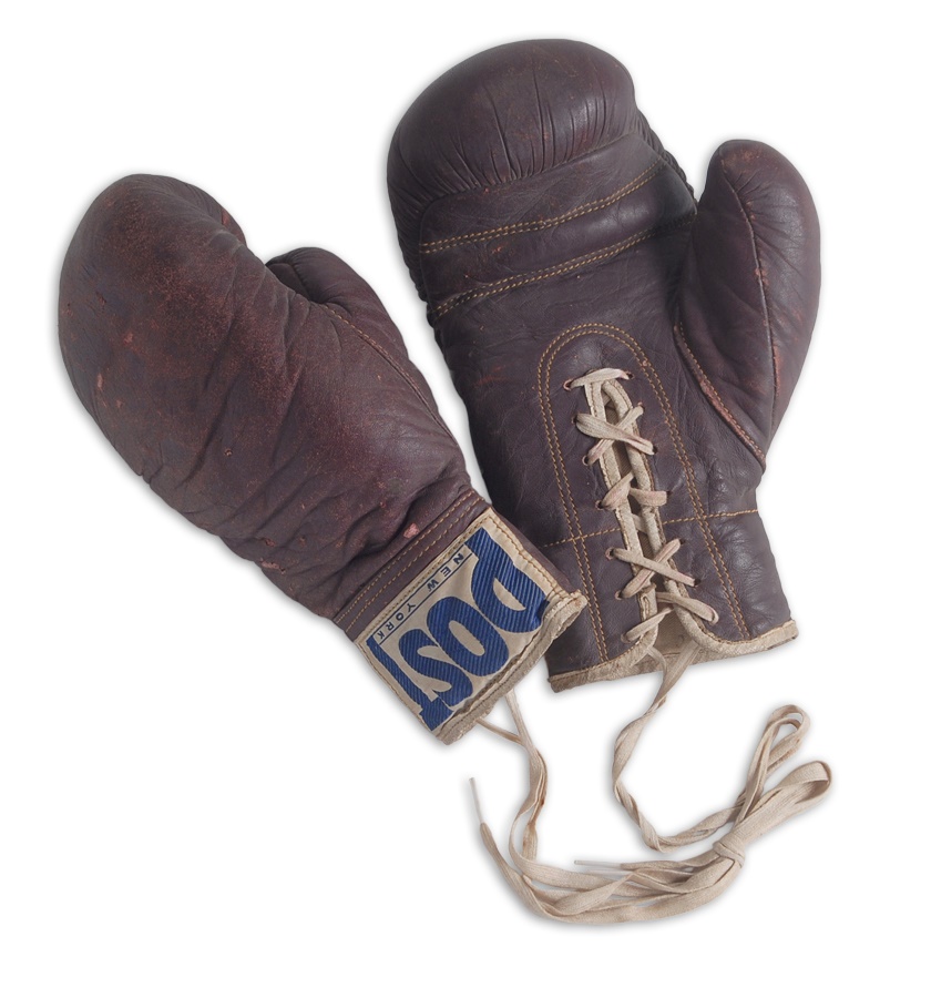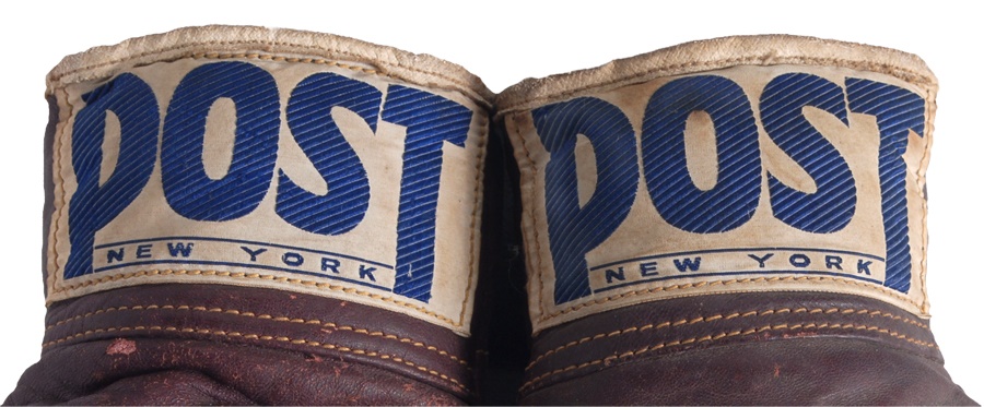 This pair of amateur training worn gloves was used by Cassius Clay (Muhammad Ali) while preparing for his early fights in Louisville, Kentucky. The gloves have "Post" labels on each wrist. Each glove is marked on the inside wrist with the initials C.C.(for Cassius Clay) in faded, but still visible ink. While they show considerable wear, they are still intact (even original white laces). Clay gave these to a friend in Louisville who boxed his brother Rudy in the amateurs. 2 LOAs.