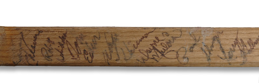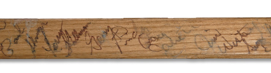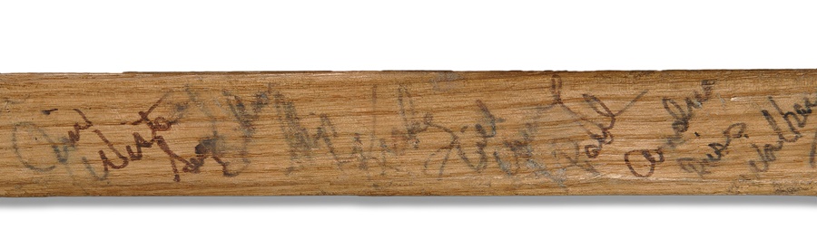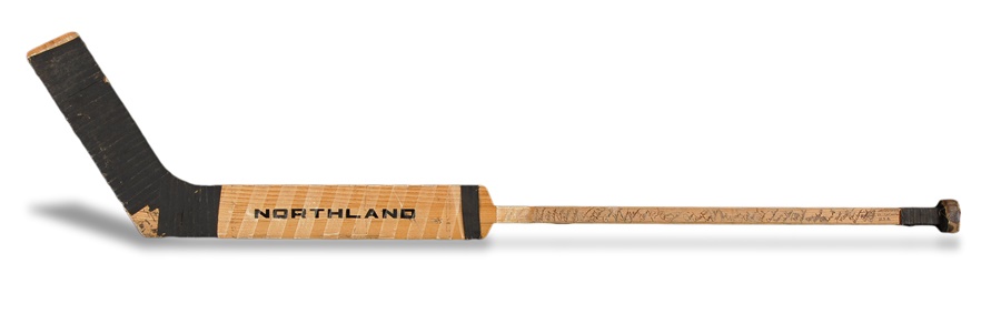 This hockey stick from the mid 1970's shows good use with original black tape on the butt end and paddle. "CHEEVERS" has been stamped on the shaft. One side of the shaft has been signed by the Crusaders team, including Gerry Cheevers. The other side reads, "Northland Custom Pro". The signatures, all in black felt tip, average a 5/10 with bleeding.