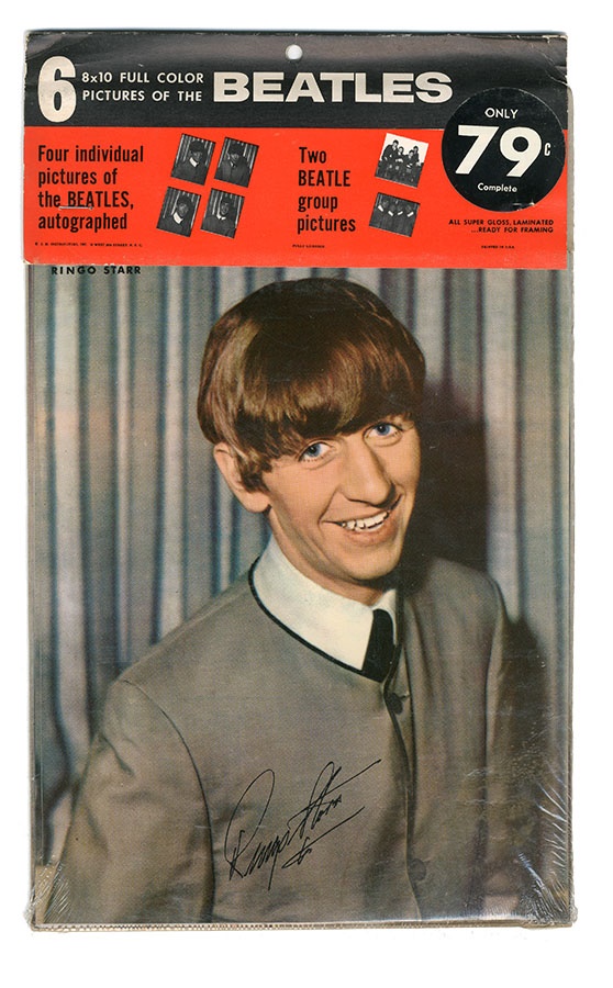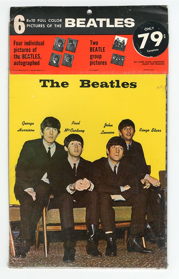 Every Beatles fan who comes across this item will take a trip back in time to the famed "British Invasion" of the 1960's. This 1964 product of Beatlemania is still sealed in its original envelope and in EX-MT condition. It contains six 8x10 full color pictures of "The Fab Four", including individual pictures of John, Paul, George and Ringo and two group photos.