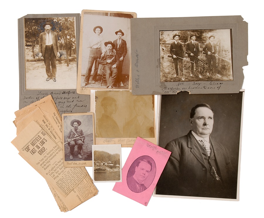 These incredible images came directly from a member of the Hatfield family, of the famed Hatfield-McCoy Feud. There are seven images here and one duotone, all dating from the turn of the century. 1) Signed Carte de Visite of "Devil" Anse Hatfield. The patriarch of the clan, he is the man who settled the field in 1891. He has signed it on the front and in a different hand on the reverse is his names again as well as the phrase “The Hero of the Desperados.” Photo measures 2.5x3.5". 2) Devil Anse Hatfield Mounted Photograph. Vintage writing on front in family member's hand reading, “Devil Anse Hatfield. Father of the "Hatfield Boys" and one of the famous gang and an interesting figure in the feudal history of West Virginia." On the reverse, on pencil, it reads "2nd Ed. Tonite." Edges of cardboard mounting are tattered. Photo measures 5.5x4". 3) Mounted photograph labeled "Joe - Troy - Elias Hatfields, all brothers and sons of old "Devil Anse." In the photo, all three are holding shotguns. Two names, Willis and (unreadable) written vertically on left side in pencil. Edges of mounting are torn. Photograph measures 5.5x4". 4) Harry Hatfield Mugshot. Front and side view. Image is very light, with what looks like faded pen marks over the front view. Photo measures 4.5x3.5". 5) Hatfield Family Autographed Cabinet Photograph. The verso reads in pencil “Complements of” with their actual autographs below, which unfortunately have been crossed out in pencil. Expert restoration may help bring them back out. Also, you can make out the very faint makings of the photographer on the reverse side of the image. Photo measures approximately 6x4". 6) Small image of the home of Cap Hatfield. Verso reads, “Home of Cap. Hatfield on the Tug River in Buckhanan (sic) County, Va. where a brilliant member of a notorious clan is spending his days in seclusion.” Photo measures 3x2.25". 7) 1921 wire photo of Cap Hatfield with two vintage newspaper clippings affixed to the back announcing his death on August 22, 1890 at age 67. Photo measures 8.5x6.5". 8) Pink duotone promotional card of George C. Love “Prosecuting Attorney of Fayette City.” The great vintage writing on verso is his bio: "Geo. C. Love, present prosecuting atty. of Fayette County, against whom Fayette County grand juries have returned a total of 171 indictments, many of hese for grand offenses, and who was pardoned in 1908 by Gov. Dawson in order that he might be eligible to office." Measures approximately 4.5x3". Total of eight pieces plus original envelope with vintage newspaper articles dealing with the Hatfield family. Articles date circa 1897.
