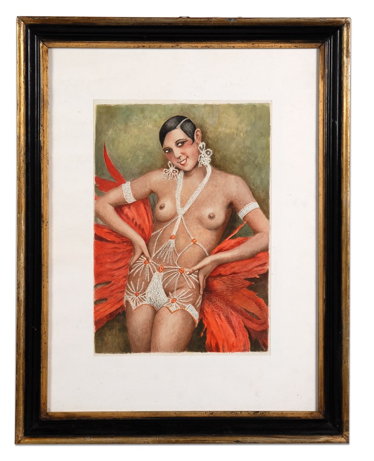 This mind-shattering watercolor was recently unearthed in Italy but was created by a French artist. The magnificent watercolor in painstaking detail shows the great Josephine Baker at the height of her fame at the Follies-Bergere in the late 1920's. Scintillatingly sexy, she is topless, dressed to the nines in the look and style that is art deco in its purest form. This is fine art rather than illustration art. The piece has been signed by the artist, has been framed to 22.5x29.5", and is also back by glass. NRMT.