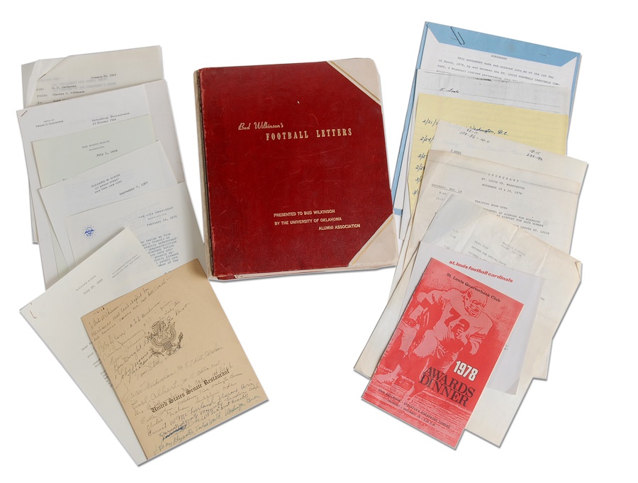This very nice collection comes from the family of Bud Wilkinson. It includes: a 1951 United States Senate Restaurant menu signed by Senators, a 1993 TLS from Richard Nixon signed with his initials, a1969 Richard Nixon TLS signed with initials, a 1967 TLS signed "Dick", other political paperwork, 1978 St. Louis Cardinals football paperwork including Bud's signed contract to coach the team (also signed by Pete Rozelle), and a presentational album from the University of Oklahoma containing over 100 issues of "Bud Wilkinson's Football Letter". The overall condition of the collection is EX.