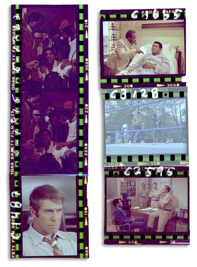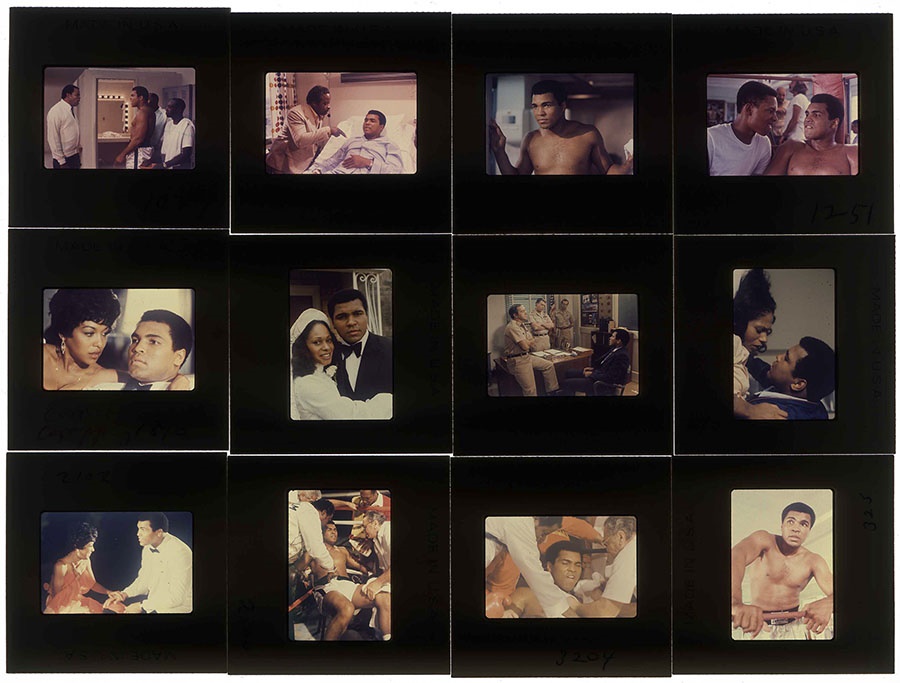 This fabulous collection of 145 original transparencies were taken by Muhammad Ali's #1 and personal photographer, Howard Bingham. These are the original stills taken for the 1977 Columbia Pictures film “The Greatest.” Most importantly, the film starred Muhammad Ali himself. Almost all transparencies are of Ali and come in two formats, Ektachrome color slides (26) and traditional 35mm film negatives (119). These are one of a kind, first generation images and "from the camera." These will produce prints of nearly unlimited size and quality. Total of 145 transparencies. Mint.