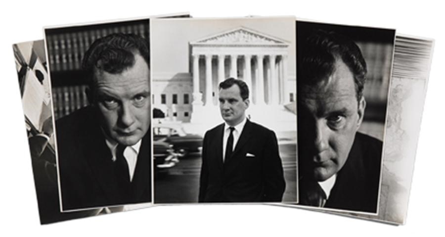 Edward Bennett Williams was a high-profile attorney who represented stars from Hugh Hefner and Joseph McCarthy to Frank Sinatra and Jimmy Hoffa. He also owned sports franchises like the Baltimore Orioles and Washington Redskins, both of which won championships during his stewardship. These (6) 11x14" black and white photographs are not dated but bear Philippe Halsman stamps on the back. The photos include profiles, DC scenics and a shot of Bennett reading over a document at his desk. They are NRMT with some trace imperfections in the prints.