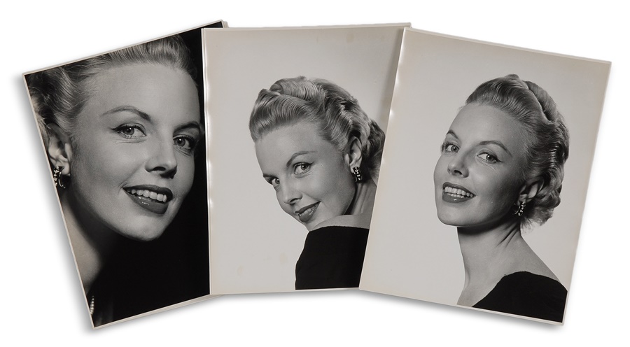 There are (5) 11x14" black and white photographs of an unidentified blonde Life magazine model from 1952 (the name Pat Burrage appears on the original folder, which is included). There are Philippe Halsman stamps on the back of each, as well as his notes in pencil. They are NRMT with some light creasing and minor discoloration.