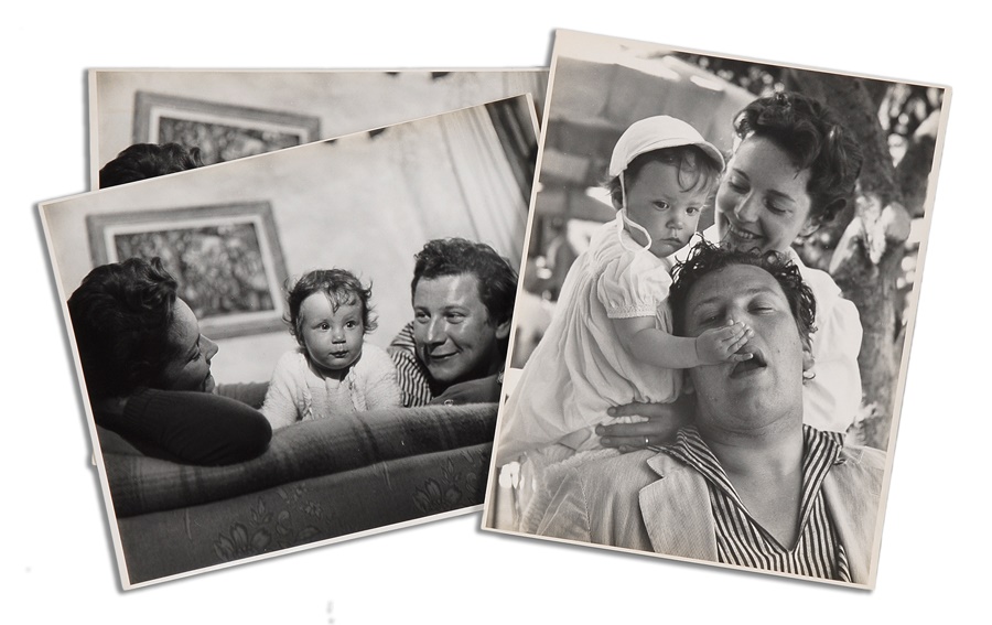 British character actor and Academy Award winner Peter Ustinov is shown in a rare family setting in these (3) 11x14" black and white photograph circa 1955. One of the photos is a duplicate of him with his wife and child horsing around. All include Philippe Halsman stamps on the back, as well as the star's name handwritten by Halsman in pencil. They are NRMT with minor creasing on the duplicate.