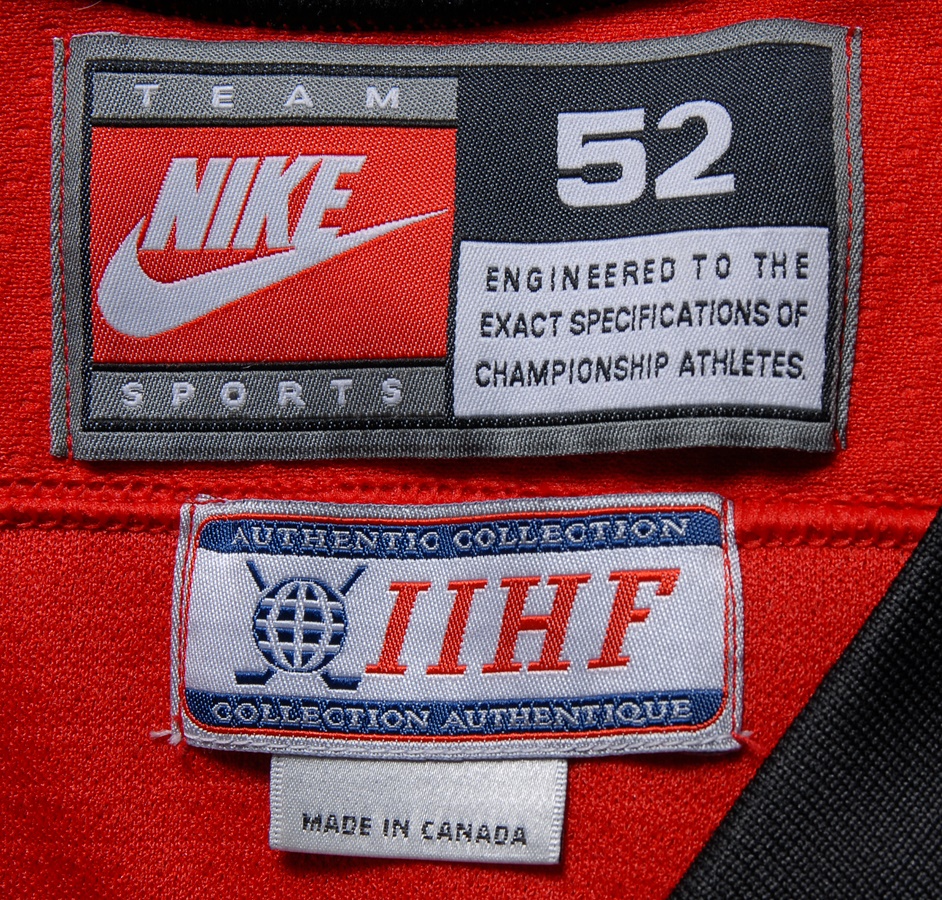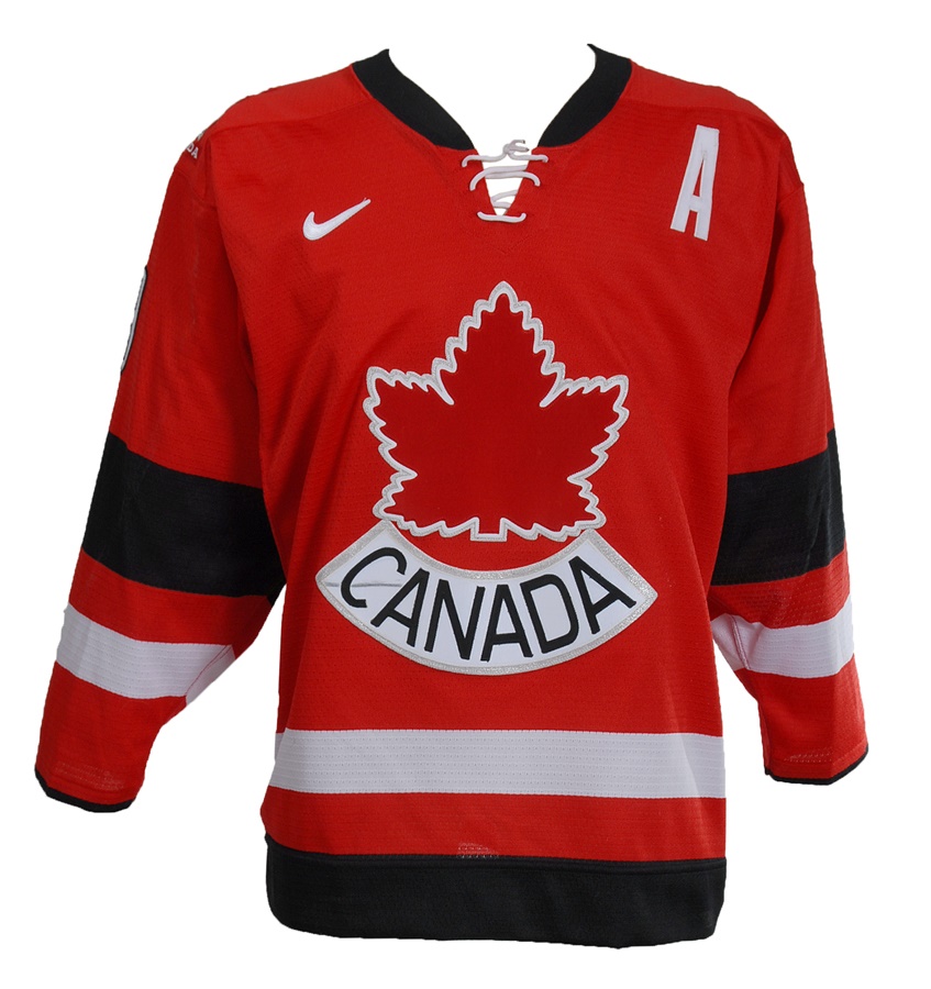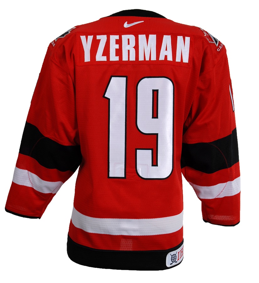 Three-time Stanley Cup champion Steve Yzerman became only the second player even to win the Stanley Cup and become an Olympic champion during the same calendar year in 2002 as he helped lead Canada to its first Olympic gold medal in 50 years. Nike size 52 and IIHF Authentic tagging in the collar. Alternate Captain’s “A” on the left chest. Photo-matched to a dark stick mark on the crest during game vs. Sweden on February 15, 2002. Another mark on the back number 9. IIHF patch sewn onto back right hem. Fight strap intact. Yzerman sewn onto name-length nameplate above his #19 on the back. Canadian Hockey Association LOA.