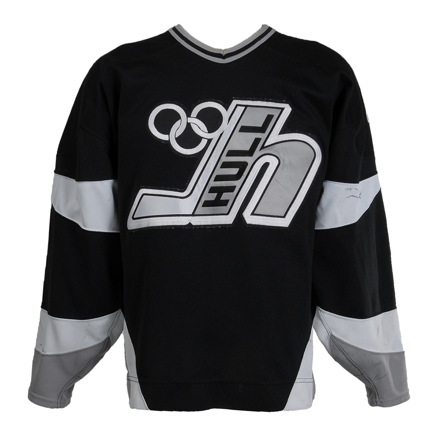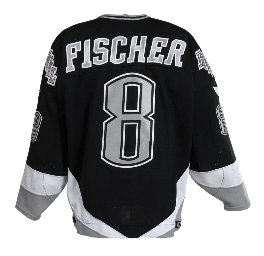Terrific pair of this hulking defenseman who delivered a slapshot greater than 100 mph. Hull Olympiques jersey was worn in first QMJHL season. Large twill/embroidered crest on the front with HULL patches on each shoulder. Sleeves show very nice use with several board burns, unrepaired holes, and small stick marks. Second offering is Fischer’s Road (red) 1st Set jersey from the 2001-02 Stanley Cup championship season in Hockeytown. Two dozen solid stick marks across the lower front. Three repairs on the right sleeve with several dark stick marks. 12 total repairs with custom sleeve extensions. Size 58. LOA from Hockeytown Authentics.