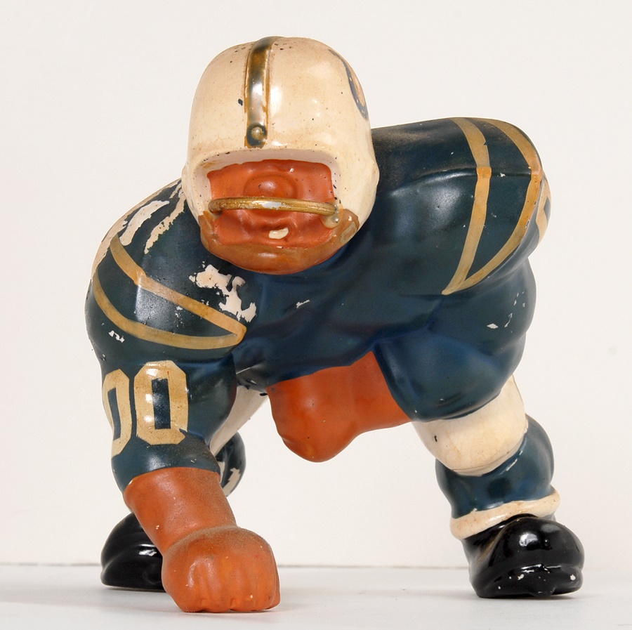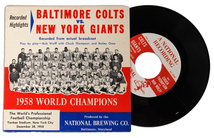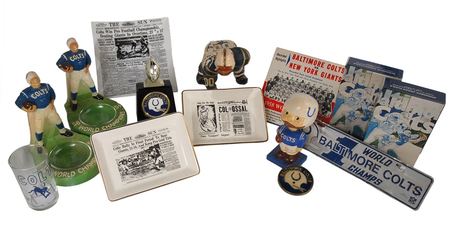 The Baltimore Colts have been one of the most celebrated franchises in professional sports, even after they moved to Indianapolis in 1984. This package includes two 1958-59 figural ashtrays (VG), including a ceramic Colt player in a three-point stance (blue paint is badly chipped), a bobblehead with wood base (has cracks), 1958 and 1959 ashtrays (all EX) with newsprint, and a Colts belt buckle. Some other quirky stuff like a bottle of cologne, jigsaw puzzles and drinking glass is included.