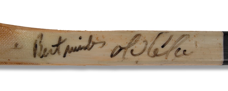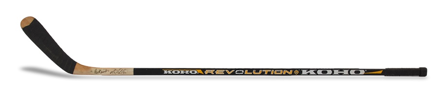 One of the greatest hockey players ever to lace up the skates, Mario Lemieux once used this black Koho Revolution stick before giving it to a young fan. It comes with a magazine article that mentions the stick and the encounter with the young fan. The stick has "LEMIEUX" stamped on the shaft and original black tape on the blade and butt end. It is signed near the blade in 6/10 black Sharpie. Lemieux played 17 seasons with the Pittsburgh Penguins, becoming the only man ever to lead his franchise to the Stanley Cup as a player and then later as an owner.