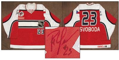 In 2000, the National Hockey League marked the 50th Anniversary of the All Star game with a spectacular week-end of hockey in the city of Toronto. As a member of the World team, Petr Svoboda took to the ice wearing this stylish red uniform. The jersey features a number of commemorative patches including those of his team, the flag of Czechoslovakia, the Colorado Avalanche, the 2000 All Star logo and NHL 2000 patch. The tail features the embroidered logos of the NHL (with silver trim), CCM and the NHLPA. Sewn into the fightstrap is the NHL's embroidered inventory number, your assurance of authenticity. Petr has signed the shirt on the back between the numbers. Light wear, as is to be expected on these gamers from the annual All Star Classic.