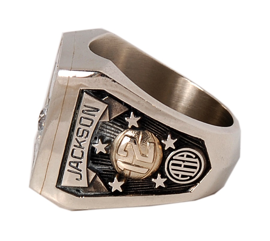 This ten karat whole gold sample ring is NRMT. The inside of the ring is stamped with "3" and "Balfour 10K". It has also been stamped with, "SA 130069-8". One side of the ring says, "Jackson 12, ABA". The other side reads, "Utah Stars, Salt Palace, 1971". The face of the ring says, "Utah Stars, ABA Champions" and has a red, white, and blue basketball on the front. There is a jadeite stone on the face of the ring. Size 10.5.
