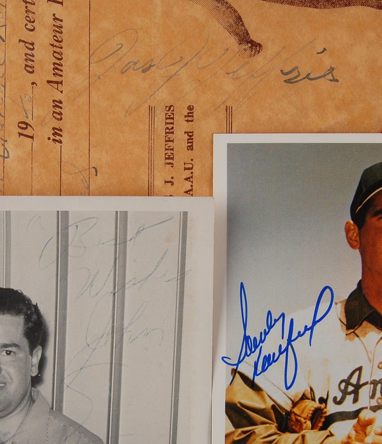 This package includes tons of great stuff from all sports: Bill Russell autograph (Sport Magazine), 1951 Giants schedule, matchbook collection of 78 (mostly 1930's), MT unused Milk Duds boxes with Palmer, Rose, McCovey, Munson, 1958 Giants ticket and keychain (promotional), '70's-'80's World Series programs, '50's Colts pics and greeting cards, full sheets of sports stamps with Lou Gehrig (23) and Babe Ruth (18), 10 signed baseballs and many other baseball autographs (Paige, Mize, Bell, Armstrong, Musial, Koufax, etc.) and boxing programs.