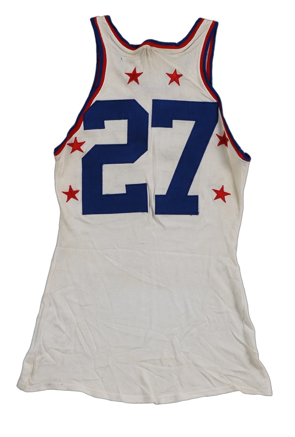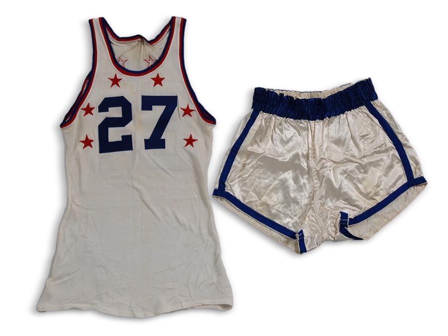 A rare piece of memorabilia from the infancy of the NBA, this classic uniform brings back images of the basketball stars of the 1950's and 1960's. A 6-foot-6 forward from the University of Cincinnati, Jack Twyman spent eleven seasons (1955-1966) in the NBA as a member of the Rochester/Cincinnati Royals franchise. He scored 15,840 points in his career, was named to the All-NBA Second Team in both 1960 and 1962, and he appeared in six NBA All-Star Games. Twyman was inducted into the Basketball Hall of Fame in 1983. This original uniform with "27" on the front and back of the jersey (made by Wilson, which is illustrated by size 42 tag sewn inside the front tail) has red and blue trim with red stars sewn on the front and back. There is one small hole on the back of the jersey near the neckline. The shorts are white satin with blue trim and contain a tag with "#27" printed on it sewn inside the waistband, along with a Rawlings size 36 tag. This uniform was originally obtained from a Twyman family member, and is the only game-worn uniform of his that has ever been offered for public sale.