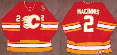 When Big Al winds up… get out of the way! Road red CCM Air-knit worn by Cape Breton's native son Al MacInnis. Tagged in the collar with "48" marked in ballpoint. Best is Calgary's commemorative 10th Anniversary patch on the shoulder. Well-washed (like most Flames gamers) with few visible marks. Extensive pilling on the inside.