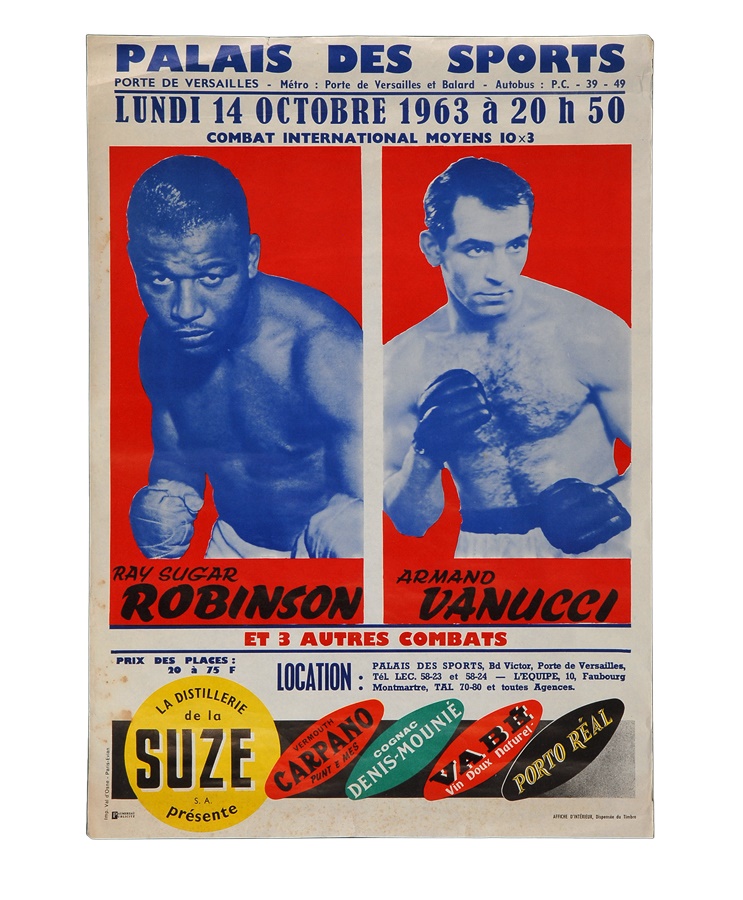 This rare poster advertises Sugar Ray Robinson and Armand Vanucci in blue and white, in front of a red background. The top reads "Palais Des Sports". The fight took place on Lundi (Monday), October 14, 1963, and, translated from French, advertises an "International Middleweight Fight". Underneath, translated, it says, "In 3 Different Fights/Bouts". The poster measures 15.5x22". There are some stains along the bottom left and bottom edges, a small tear between the letters "i" and "s" in "Palais" on top, and a couple of vertical folds along the top. VG.