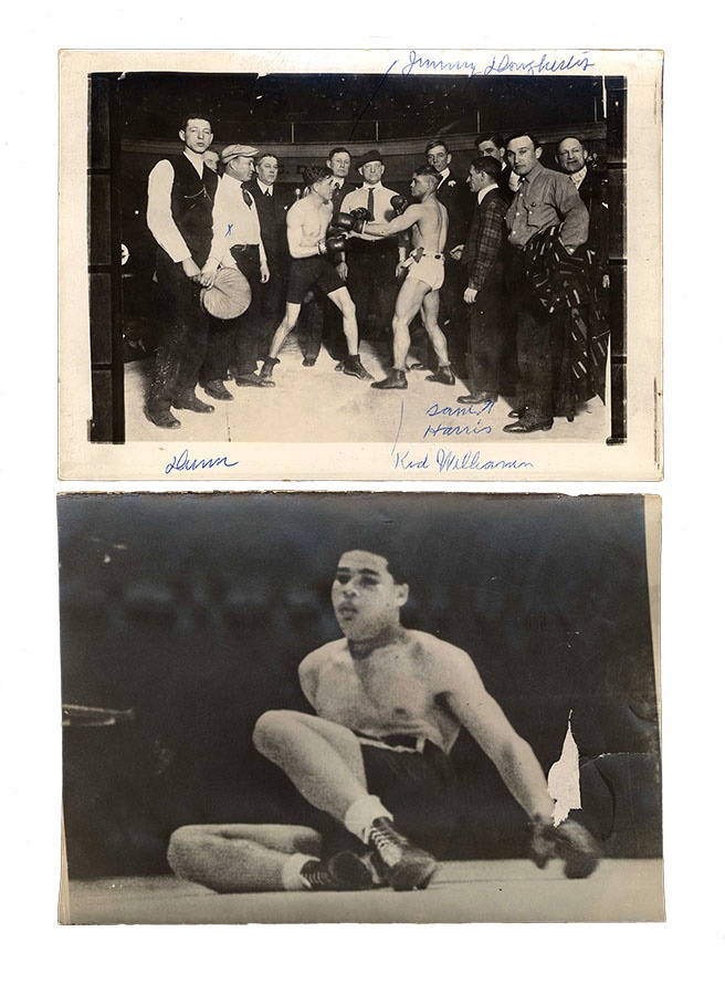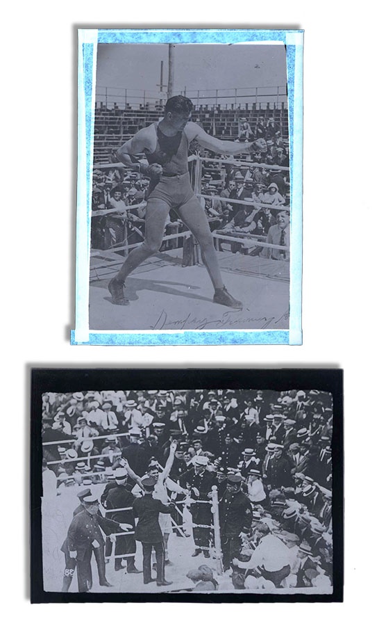 Offered here is an important group of mostly 20th century boxing and wrestling negatives and photographs from the collection of Perry Wiley. There are more than 280 envelopes containing first and second generation negatives of greats like Dempsey, Johnson, Corbett, Gans and Baer. Also 4 vintage Kodak sheet film boxes with negatives. Approximately 50 postcard size photos including Joe Louis, Strangler Lewis, Kid Williams, Harry Lewis and many more. A fantastic assortment from the golden era of both sports.