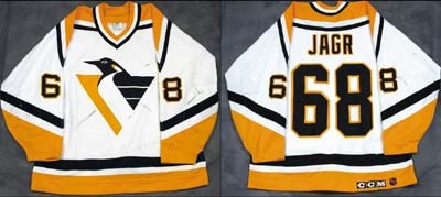 Well-worn white Penguins uniform worn by the league's top sharpshooter Jaromir Jagr during the later 1990's. CCM gamer tagged in the neck with "68" noted in marker by the trainer, Steve Laten. Short nameplate on the back above the numbers. The shirt exhibits very heavy use with count-less stick slashes, board burns and a few unrepaired holes. The interior shows wear with areas of pilling and salt in the fightstrap. If you're looking for a Jagr with good wear, this one is it! Direct from the team, with documented proof.