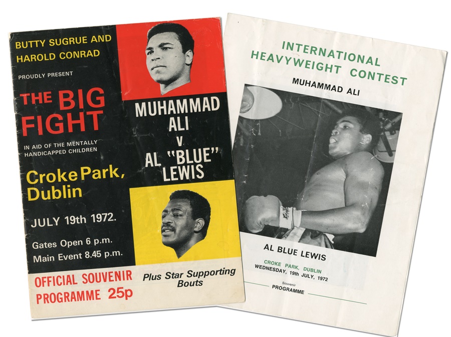 This package includes two programs from "The Greatest" Muhammad Ali and his bout against Al "Blue" Lewis in Dublin, Ireland in 1972. This package is a must-have for any Ali or boxing fan as memorabilia for one of his 56 professional wins. Contains pictures, tale of the tape and much more. The Muhammad Ali vs. Al Lewis program, which is red, yellow, black and white is an "Official Souvenir Programme". The other says "International Heavyweight Contest, Muhammad Ali, Al Blue Lewis" and is a souvenir programme.