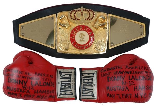 On May 7, 1987 the “Golden Boy” Donny Lalonde and Mustafa Hamsho fought at Madison Square Garden in New York for the vacant WBC Continental Americas Light Heavyweight Championship. Lalonde won a 12 round decision to win the title. Here are the fight worn gloves used by Donny Lalonde in that bout and the championship belt he was awarded for winning it. The gloves are red leather and have the manufacturer’s label for Everlast. Each glove is marked on the backhand “CONTINENTAL AMERICAS LIGHT HEAVYWEIGHT TITLE DONNY LALONDE W-12 MUSTAFA HAMSHO MAY 7. 1987 N.Y.C.” (MSG). Gloves and belt are in excellent condition.