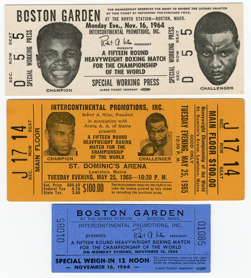 The two Ali vs. Liston fights for boxing's world heavyweight championship were among the most anticipated and controversial fights in the sport's history. Prior to his name change to Muhammad Ali, Cassius Clay first faced Sonny Liston in the Boston Garden on November 16, 1964 and this NR/MT working press ticket displays head shots for both fighters. The original, full-ticket for the weigh-in that same day is also NR/MT. The original, full ticket to the Lewiston, Maine bout six months later appears EX but has some pen writing on the back.