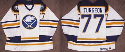 450-plus goals and nearly 700 helpers. Pierre Turgeon wore this Sabres CCM knit during games at the Aud during the 1990-91 season. "Turgeon" crosses the nameplate above Pierre's "77". Tagged in the collar by Maska with a faint “54" in ballpoint. Hundreds of stick marks in varying sizes and shades with a pair of nice team repairs. Decent pilling inside below the fightstrap. Comes with Letter of Authenticity.