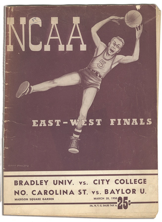 This unscored NCAA East-West Finals program advertises "Bradley Univ. vs. City College" and "No. Carolina St. vs. Baylor U.". It took place at Madison Square Garden, and on March 28, 1950. The program grades GD-VG.