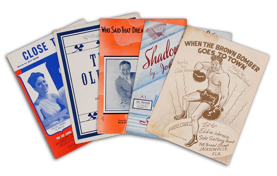 An interesting lot of early boxing sheet music including: Joe Louis-"When The Brown Bomber Goes To Town" (VG), Jimmy Braddock-"Shadow Boxing" (EX), Max Baer-"Who Said That Dreams Don't Come True" (EX), Tex Rickard-"Tex, Old Pal" (VG), and Joe Louis-"Close To Me"(EX).
