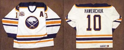 By the time you read this, Dale Hawerchuk will be the newest inductee in the Hockey Hall of Fame. Dale accumu-lated 518 goals and 1409 points over his sixteen NHL sea-sons. This jersey was worn during the Sabres 25th Anniversary season and features the team's commemora-tive patch on the chest. CCM Air-knit with loads of stick marks and board burns, especially on the front and sleeves, with one repair. Tagged in the collar with the size "52" fly tag. Heavy pilling inside. Originally obtained from the Sabres with their Letter of Authenticity on team letterhead.