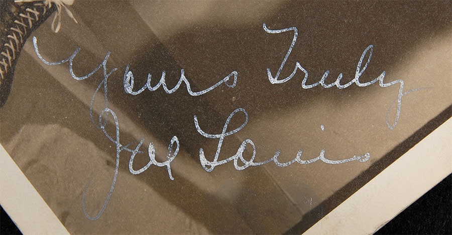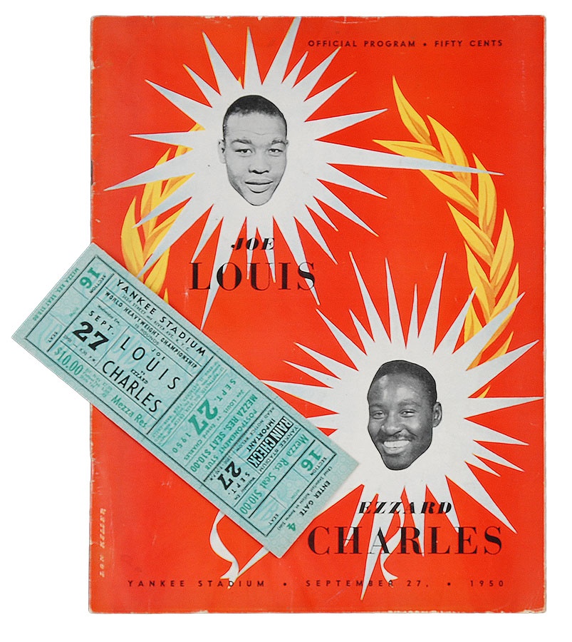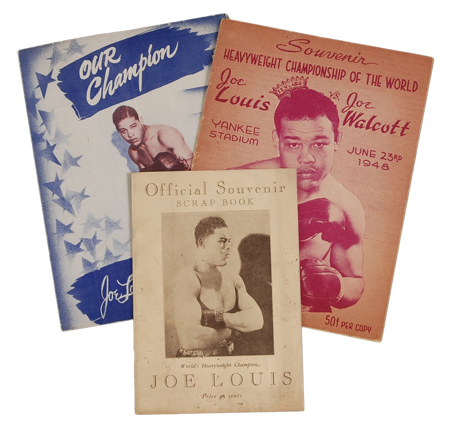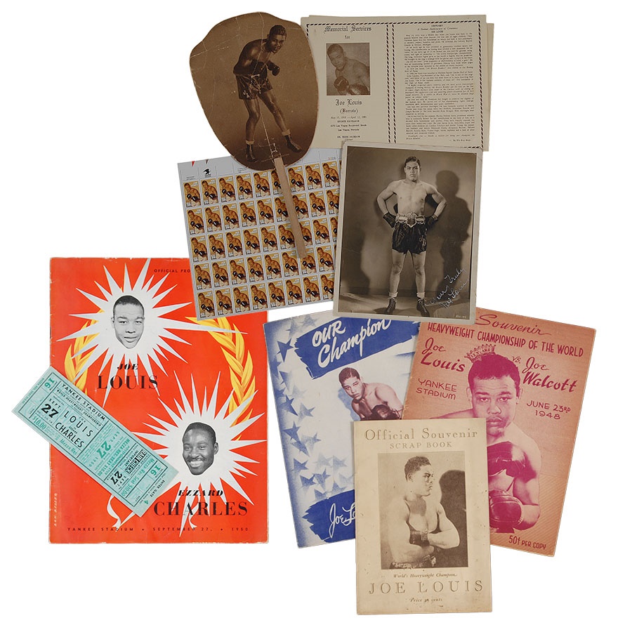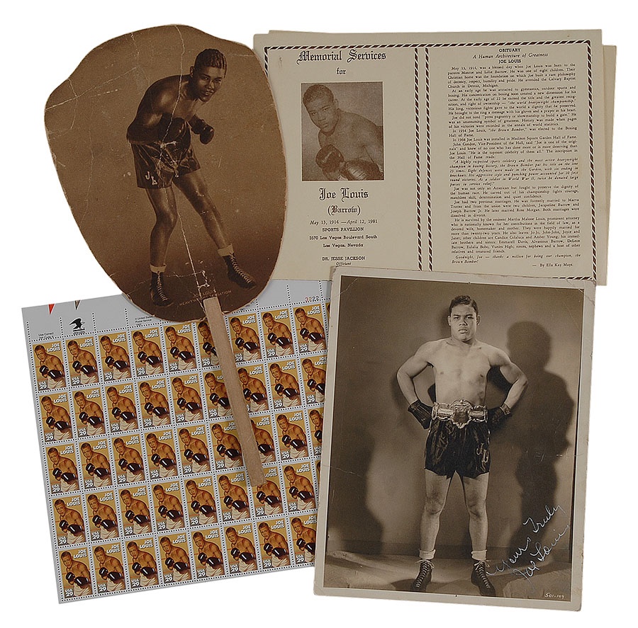 This group is highlighted by an official program for the Louis-Charles fight on 9/27/50 (EX), a full ticket to the fight (EX), a souvenir program for the 6/23/48 fight with Jersey Joe Walcott (VG), and a 1938 souvenir advertising fan picturing Joe Louis on the front (VG). Also included is the funeral program for Joe Louis (EX), the 1939 booklet, Joe Louis Scrapbook (Fair), 50 Joe Louis stamps (EX+), the booklet Our Champion Joe Louis (Fair), and a beautiful 8" x 10" studio portrait of Louis wearing his championship belt with a secretarial signature (VG).