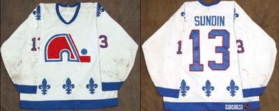 Battered blue and white jersey worn in the capital city of Quebec by the statuesque Swede Mats Sundin. Maska Ultrafil knit in home colors with everything sewn on includ-ing the two-tone back and sleeve numbers (#13). Tackle twill NOB across a short plate. Tagged in the neck with additional size "56" fly tag. Not a single square inch of sleeve is left unblemished as they are both covered in countless stick marks and slashes. Patches of interior pilling to match the exterior wear. A well-worn example, sporting a bold signature (inside) behind the crest. LOA.