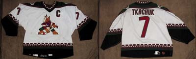 Two-time 50-goal-man Keith Tkachuk donned this intricately designed Phoenix Coyotes uniform during the 97-98 NHL season. The shirt shows heavy use with numerous black stick marks on the front and arms. Extremely heavy interior pilling. Keith's surname crosses the back plate and his captain's "C" appears on the left breast. An extensive package of documentation including an LOA from the Coyotes on their letterhead is your assurance of authenticity. In addition, the jer-sey can be matched to photos in the 'Yotes 98-99 media guide showing Keith wearing this exact shirt. A well-worn example from this prolific scorer.