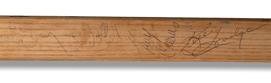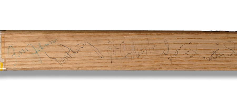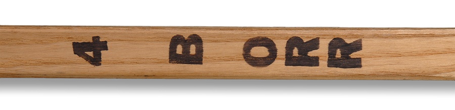 Bobby Orr is regarded as the greatest player in Boston Bruins history and the standard setter for defensemen in the NHL. This 54" Victoriaville model hockey stick is signed by the entire Boston Bruins team, the Stanley Cup Champions of the 1971-72 season. The stick is littered with signatures in different colors (ball point ink) with Orr's first initial, last name and number imprinted on the handle of the stick.