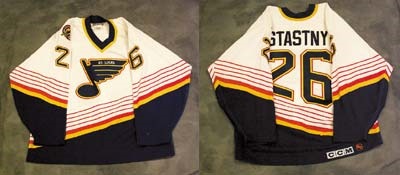 Peter Stastny retired from the game of hockey shortly after the schedule resumed following the lockout of 1994-95. Stastny played in precisely one home game that season, on Jan 26th (Gretzky's birthday) against the Kings at the Keil Center in St. Louis. This is his final home white uniform worn that night. CCM Air-knit, in size 54, with "26" in ballpoint on the tag matching the number on the back and sleeves. Light wear, as expected, includes a board burn and a few stains. Set tag in the hem reads "Official St. Louis Blues 1st Set 1994-95 Season" with the trainer's "451 94A" set number noted in marker. The team's numbered Bluenotes Authentics hologram is affixed to the hem, and this number has been confirmed by the team. Detailed Letter of Authenticity and copy of the score sheet from the game accompanies the jersey.