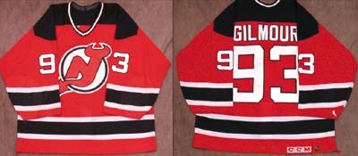 Red Devils sweater customized for gritty forward Doug Gilmour. CCM Air-knit with the plated "Gilmour" and "93" on the back and sleeves. Custom shortened cuffs. Screened "2nd Set" stamp and Custom Crafted logo on the inside hem. Decent wear with board burns, stick marks a large team repair. Extensive package of documentation including the team's LOA on Devils stationery.