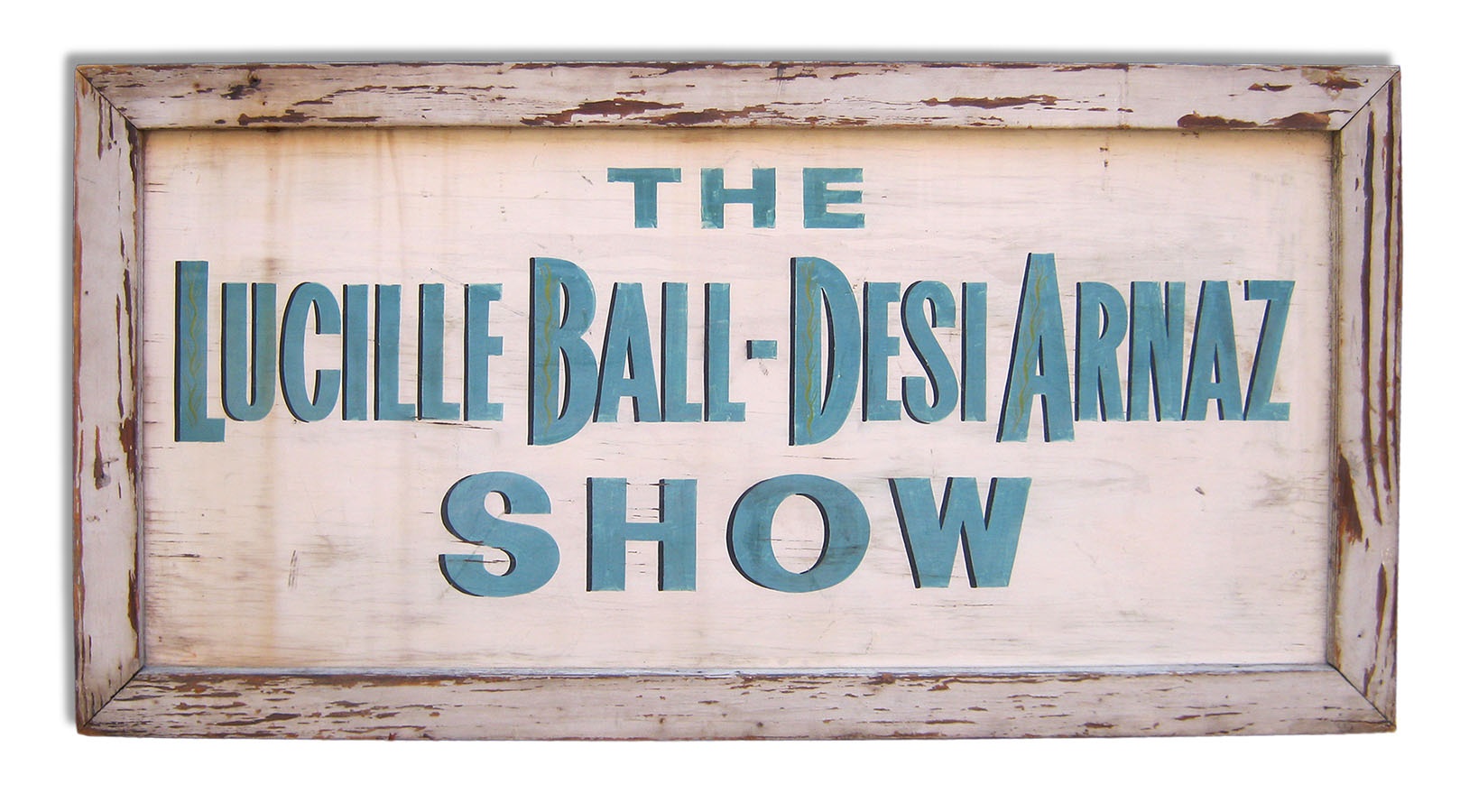 This Lucille Ball-Desi Arnaz Show sign is the very sign that hung at Desilu Studios when they shot the final season of I Love Lucy. The most popular show in television history, this is the only decent representation of memorabilia we have seen from that classic of classics. A significant 48x25x2", it is double-sided. Each side is painted with the magnificent title of the show. In beautiful pastels, it is all on heavy wood where it hung on the ceiling. It is in very good condition with a tiny amount of paint loss. Purchased at the Rose Bowl Flea Market in Los Angeles in 1983 for $60, it is one of the great finds in collectibles history. A fresh piece, it has only had two owners since then, and is one of the classic pieces of television memorabilia.