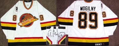 A 76-goal showing with the Sabres early in his career is ample evidence that Alex Mogilny can compete with the league's top scorers. The Canuck Place commemorative patch decorates this black road Vancouver jersey worn the by Soviet star during the 1996-97 season. Tagged by Maska in the neck beside a size "54" fly tag with the embroidered NHL and CCM logos on the tail. "Mogilny" runs across the back nameplate above the number "89". A bold signature sits between the two numbers. Scattered marks and slashes in various shades tell the tale of the game wear on this one. Included is the team's Letter of Authenticity on Canucks Orca Bay letterhead.