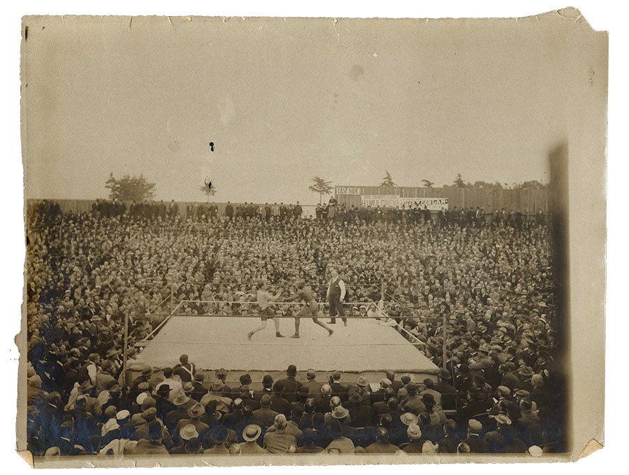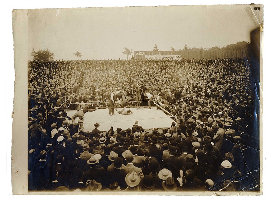 Two original, first generation photographs depicting action sequences from the October 16, 1909 World Heavyweight fight between champion Jack Johnson and middleweight champ Stanley Ketchel. Johnson stopped Ketchel in round 12 in Colma, California. Approximately 8x10". VG-EX. Rare, especially in this size.