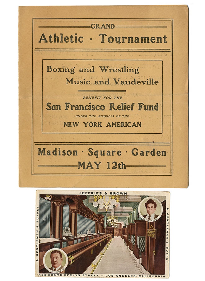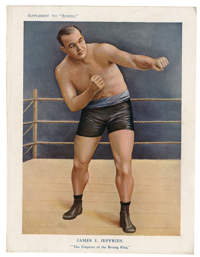 This group consists of an early 8x10" paper supplement of Jeffries, and a significant early boxing and wrestling exhibition program featuring Fitzsimmons, Corbett, Young Corbett and others. VG-folded in half. There is also a Jeffries and Brown advertising postcard (EX-used) and a Fitzsimmons-Jeffries reproduced black and white photo.