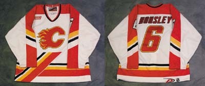 Phil Housley added another 55 points to his 1000-plus total during 1999-2000. This is his home Calgary Flames air-knit Pro Player jersey featuring the NHL 2000 patch on the right breast. Tagged in the collar and again in the hem in size 54. Lighter wear with a good number of stick marks and board burns on the body and sleeves. Set tag in the hem reads "Calgary Flames Hockey Club, 1900-2000 NHL Season, White Jersey, #2 of 3". Letter of Authenticity on Calgary Flames letterhead.