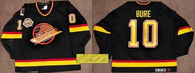 Now that Pavel and brother Valeri are teamed up, the points will come fast and furious. A pair of 25th Anniversary and Canuck Place commemorative patches adorn this black road Vancouver Canuck's uniform worn by Soviet star Pavel Bure during the 1994-95 season. Tagged by Maska in the neck beside a size "54" fly tag with the embroidered CCM and NHL logos on the tail. Stunted nameplate above the back numbers just long enough to fit the letters "Bure". Game wear includes multiple board burns, stick slashes and an unrepaired hole. Extensive pilling inside. Pavel has added his flowing signature on the back numbers. Comprehensive pack-age of documentation and provenance includes two Letters of Authenticity.