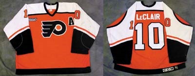 John LeClair's orange road Flyers uniform from the 1999- 2000 campaign, tagged by CCM in size "58" with silver NHL and CCM embroidered onto the tail. Alternate "A" on the left breast with the NHL 2000 patch on the opposite side. Game use includes a good number of marks and slashes, especially on the arms. Letter of Authenticity.