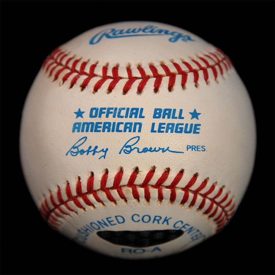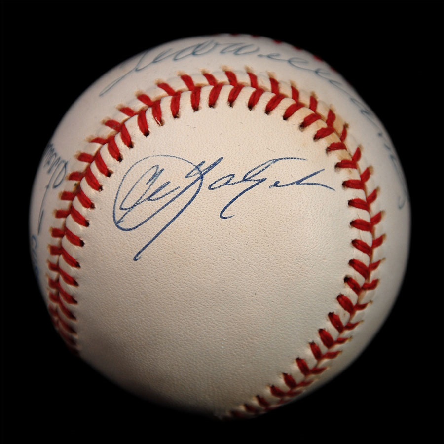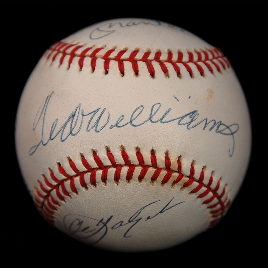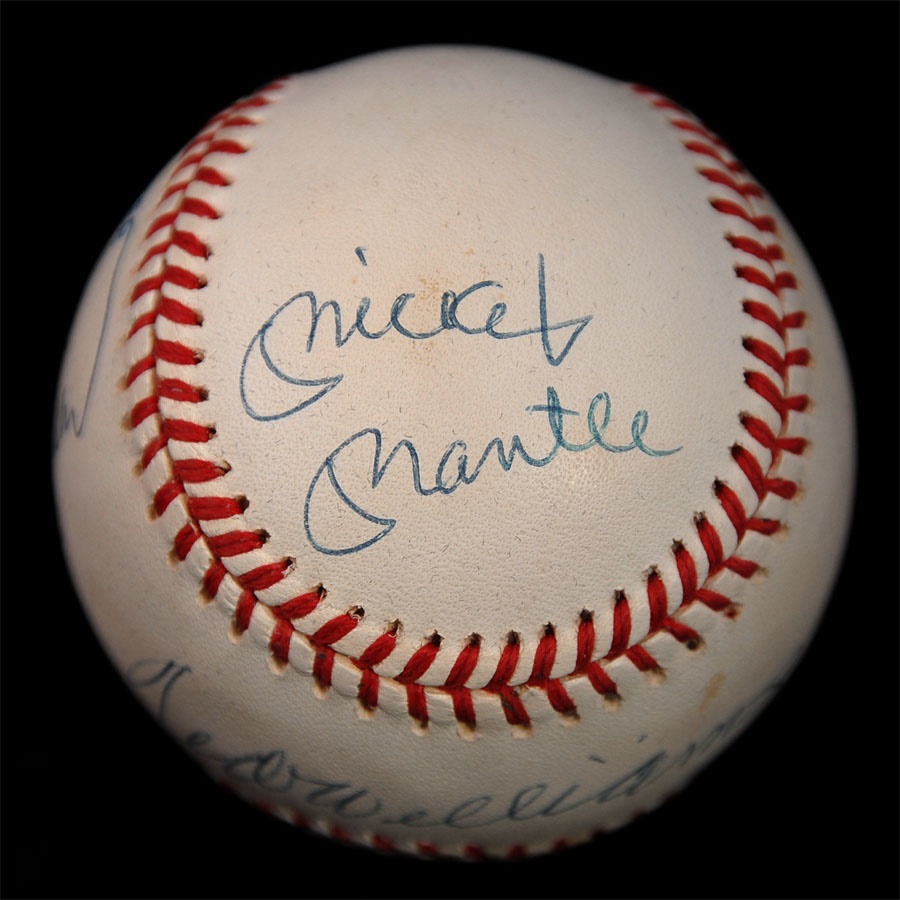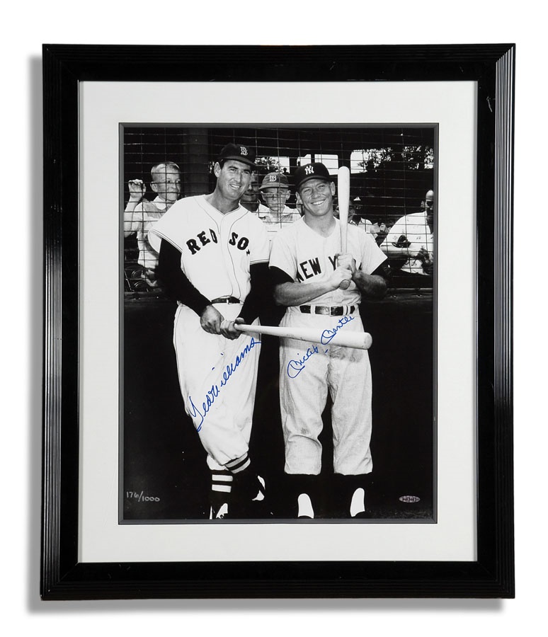 There have only been 13 Triple Crown winners in baseball history (batting average, home runs, RBI) and two of that elite club - Hall of Famers Mickey Mantle and Ted Williams - signed this ball and photo. Both have been authenticated by Upper Deck, with the photo being NRMT with hologram and 9/10 signatures in blue Sharpie. The ball - a NRMT American League (Bobby Brown) model - comes with the certificate, hologram and 8/10 signatures, also in blue Sharpie. Mickey Mantle earned his crown in 1956, while Ted Williams is one of only two men to have turned the trick twice (Rogers Hornsby was the other), in 1942 and 1947.