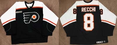 The NHL's silver stitched shield logo and commemorative 2000 patch decorate this black version of Philly's uniform. Mark Recchi put the wear on this one according to the num-bers and namebar. CCM tag and "52" fly tag in the collar. Lighter use with a number of solid stick slashes on the sleeves.