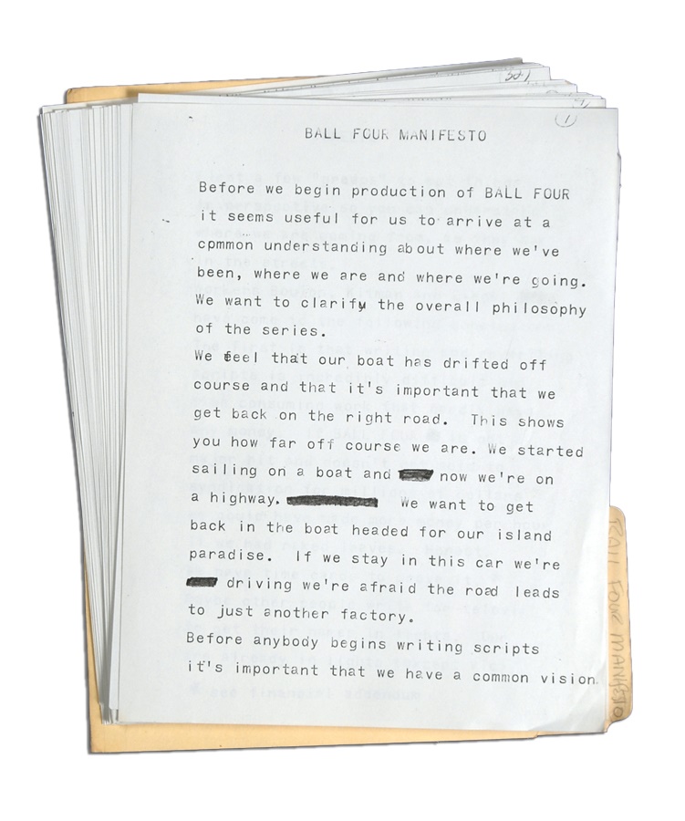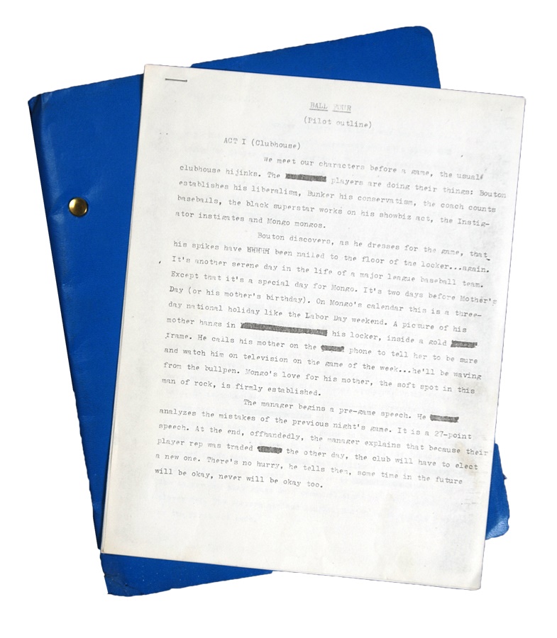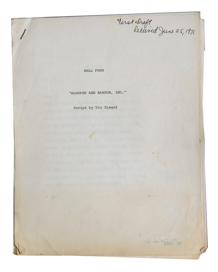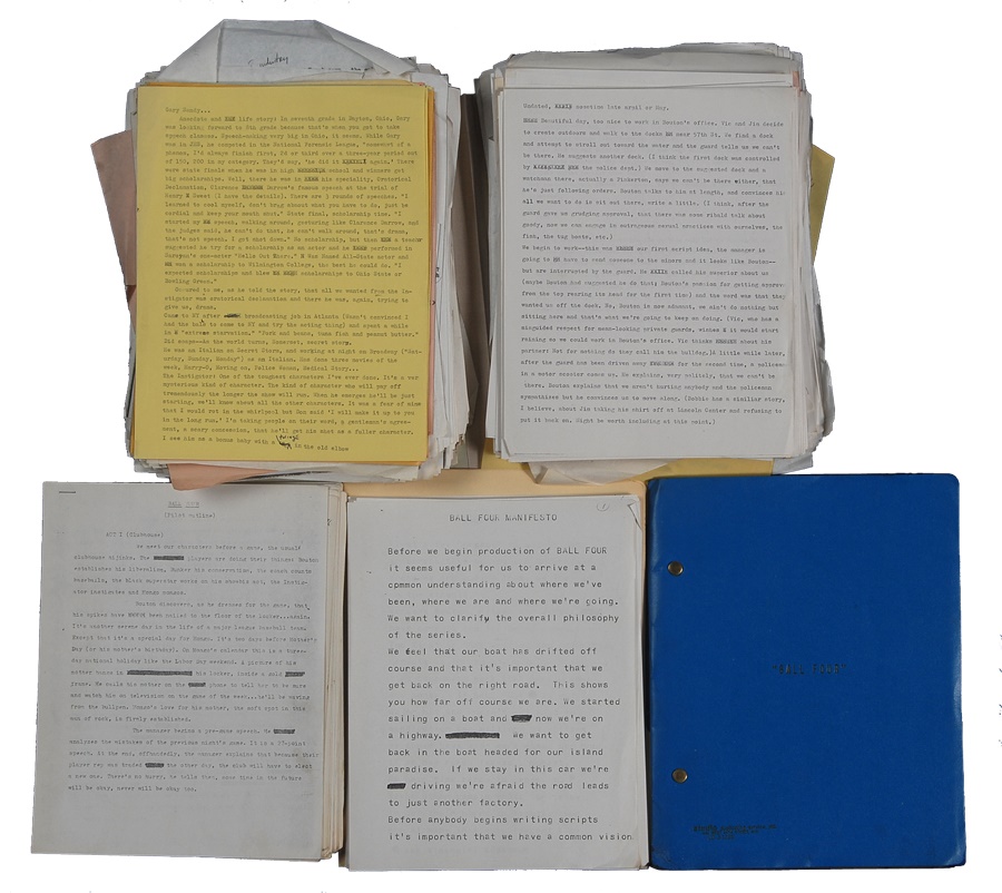 This lot features more than 500 pages from original scripts and various notes from the short-lived 1976 television series “Ball Four.” Based on the noted baseball book by Jim Bouton, the series was written by noted New York sports columnist Vic Ziegel. There are literally hundreds of pages of material including the original pilot, episodes, supporting characters, plot information and production meeting notes and the all-important “Manifesto.” All come with original notes by Ziegel. The show was unsuccessful and CBS canceled it after just five episodes. This lot preserves it for baseball fans.