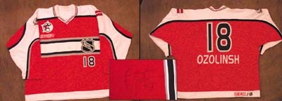 In 2000, the National Hockey League marked the 50th Anniversary of the All Star game with a spectacular week-end of hockey in the city of Toronto. Sandis Ozolinsh wore this attractive red uniform as a member of the World squad. The jersey features a number of commem-orative patches including those of his team, the Colorado Avalanche, the 2000 All Star logo, the NHL 2000 patch and the flag of his native country. The tail features the embroidered logos of the NHL (with silver trim), CCM and the NHLPA. Sewn into the fightstrap is the NHL's embroi-dered inventory number. Originally purchased from the Colorado Avalanche. Light wear, as is to be expected on these gamers from the annual All Star Classic.