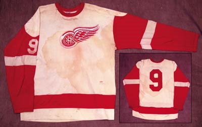 Only one player can lay claim to the handle "Mr. Hockey". Gordie Howe did it all. Howe retired from the game at the astonishing age of fifty-one after thirty-two seasons with six Hart's, four Stanley Cups, 801 goals and 1850 points. And that's not counting WHA stats! Gordie wore this red and white uniform towards the end of his tenure with the Detroit Red Wings. This heavy dureen jersey features the embroidered winged wheel crest on the front with Howe's number "9" on the back and again on each sleeve. The collar displays the "Olympic Sporting Goods" supplier label with the size "48" fly tag below. An additional tag in the hem identifies General Athletic as the manufacturer and helps in dating the jersey to the mid-to-late 1960's. Gordie was not one to tuck in the elbows and this jersey has the scars to prove it. One sleeve is plastered with eight team repairs and another stitched patch appears on the opposite arm. Further testament to the trainer's sewing skills can be found on the body of the jersey. Decent wear throughout with a few black stick slashes, some board burns and a number of unrepaired holes. This prime example has been thoroughly examined and comes to you with excel-lent documentation and our unwavering assurance of authenticity.