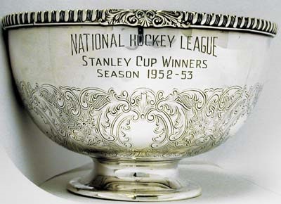 Trophy presented to Gerry McNeil Stanley Cup splendor in sparkling silver. Netminder Gerry McNeil shut down the opposition, carrying the Habs all the way to glory during the 1952-53 playoffs. To commemorate their Championship season each member of the team was present-ed with this ornate silver-plate trophy bowl, a replica of Stanley's original grail. Engraved is "National Hockey League Stanley Cup Winners, Season 1952-53" and oClub de Hockey Canadien Inc., Gerry McNeil". In excellent condition. A hard-to-find style, much rarer than the later mini-Cups.
