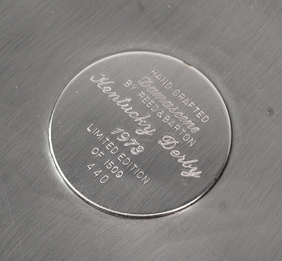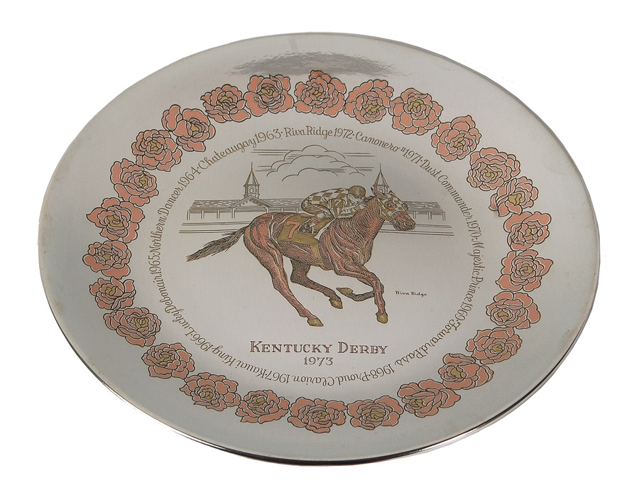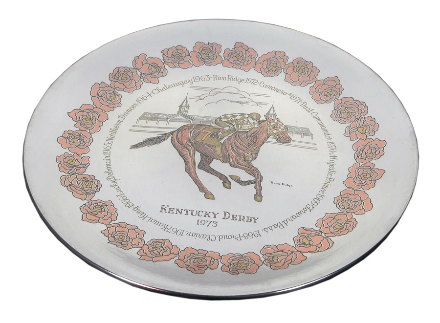 This 1973 Kentucky Derby plate commemorates the Derby and features the winners from the preceding 10 years. The center of the plate features an engraving of Riva Ridge, the thoroughbred who won the '72 Derby. Engraved around the plate's perimeter are the winning horse's names and years: Riva Ridge, 1972; Canonero II, 1971; Dust Commander, 1970; Majestic Prince, 1969; Forward Pass, 1968; Proud Clarion, 1967; Kauai King, 1966; Lucky Debonair, 1965; Northern Dancer, 1964; Chateaugay, 1963. The verso of the plate features a small disc that reads "Hand crafted Damascene, by Reed & Barton. Kentucky Derby 1973 Limited Edition of 1500 - 440." The plate is silver-toned metal but there is no stamp to indicate what metal it is. It is framed and EX.